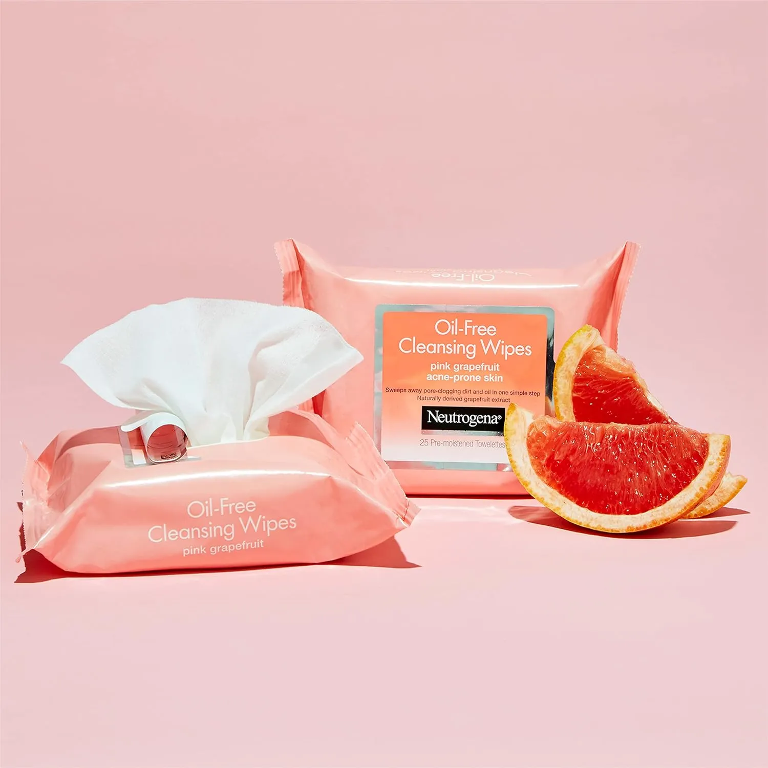 Neutrogena Makeup Remover Cleansing Towelettes are oil-free face wipes designed for oily and acne-prone skin, removing makeup, dirt, oil, and bacteria in one simple step with no need to rinse. These scented facial cleansing wipes feature pink grapefruit scent for a refreshing experience and are dermatologist- and allergy-tested for added peace of mind. The twin pack includes two resealable 25-count packages, keeping wipes moist and making them ideal for daily use at home, the gym, or while traveling. As makeup remover wipes for face, they cleanse thoroughly without leaving heavy residue, helping skin feel clean and fresh. Convenient and disposable, these facial cleansing towelettes simplify your skincare routine and are suitable for use anytime you need quick, effective cleansing. For best results, reseal the package after each use to maintain moisture. From a dermatologist-recommended brand, these face wipes offer a practical solution for facial cleansing, especially for those with oily or acne-prone skin. Enjoy the uplifting pink grapefruit scent and the confidence of clear, refreshed skin with Neutrogena Makeup Remover Wipes. These makeup remover wipes are suitable for cleansing your face at the end of the day, before or after workouts, or while traveling, and the oil-free formula ensures they are suitable for oily and acne-prone skin types. The resealable packaging helps preserve moisture, making these face wipes a reliable choice for on-the-go cleansing. Use these facial cleansing towelettes as part of your daily skincare routine to remove dirt and oil and experience the convenience of disposable wipes that require no rinsing. Neutrogena Makeup Remover Wipes with pink grapefruit scent are trusted for those seeking effective, convenient, and refreshing facial cleansing in a single step.