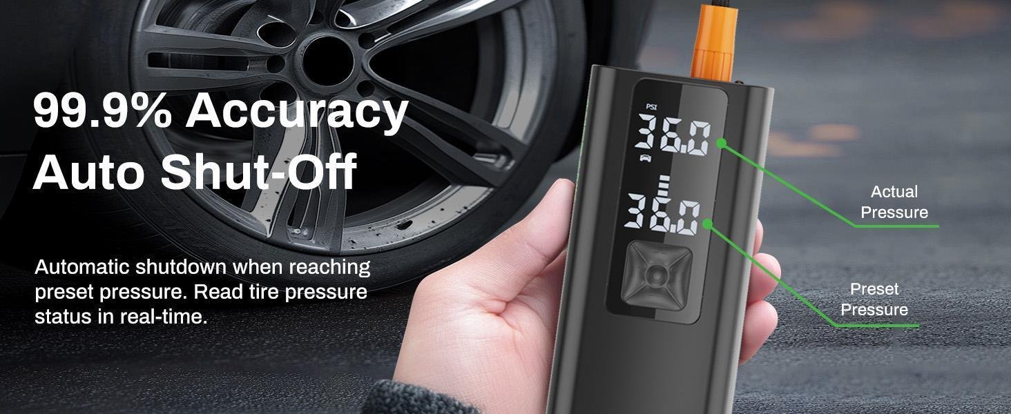99.9% ACCURACY- The air compressor is equipped with an upgraded high-precision chip, which improves the tire pressure detection accuracy to ±1PSI. The LCD screen displays real-time pressure and preset value, when the preset value is reached, the pump will automatically shut down to avoid Overinflation.